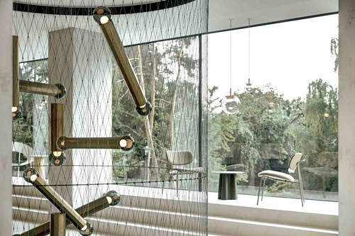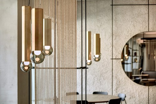 This hospitality interior features a contemporary look, showcasing multiple pieces from BROKIS, a renowned Czech lighting brand which is upholding a strong glassmaking tradition.